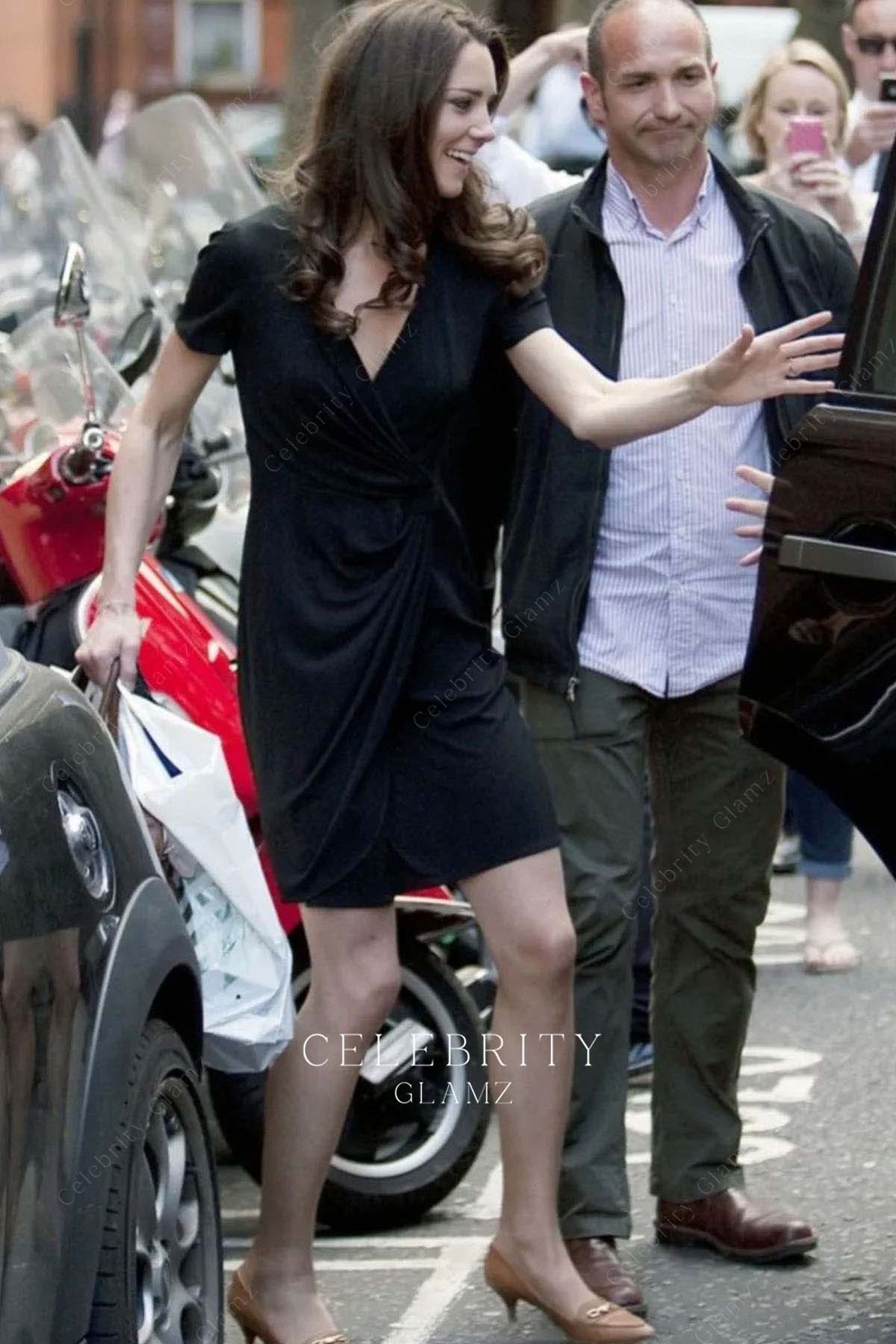 Recreate Kate Middleton's chic pre-wedding style with this black jersey wrap dress. Featuring a flattering V-neck, short sleeves, and a stretchy bodycon mini skirt—perfect for casual outings or stylish parties.