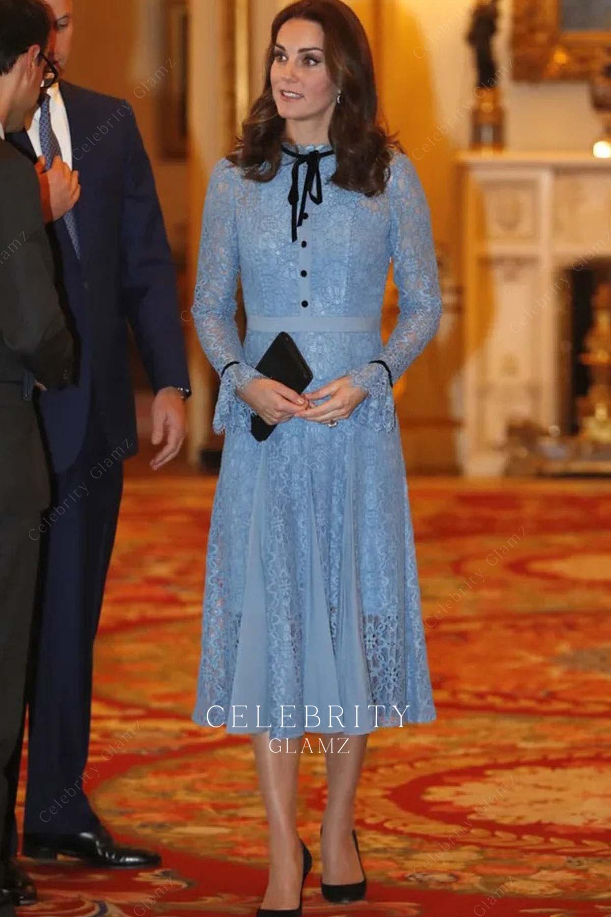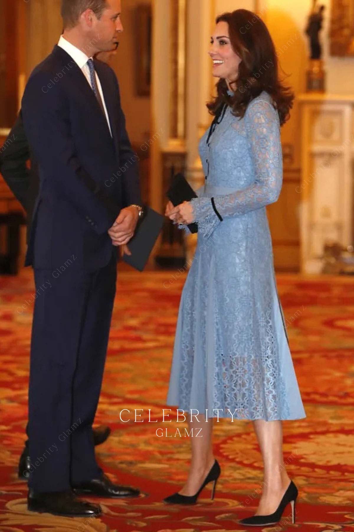 Kate Middleton stuns in an ice blue lace tea-length dress at the 2017 World Mental Health Day Event. Featuring a high neck, sheer long sleeves, A-line skirt, and double godets, this gown blends elegance with timeless charm.