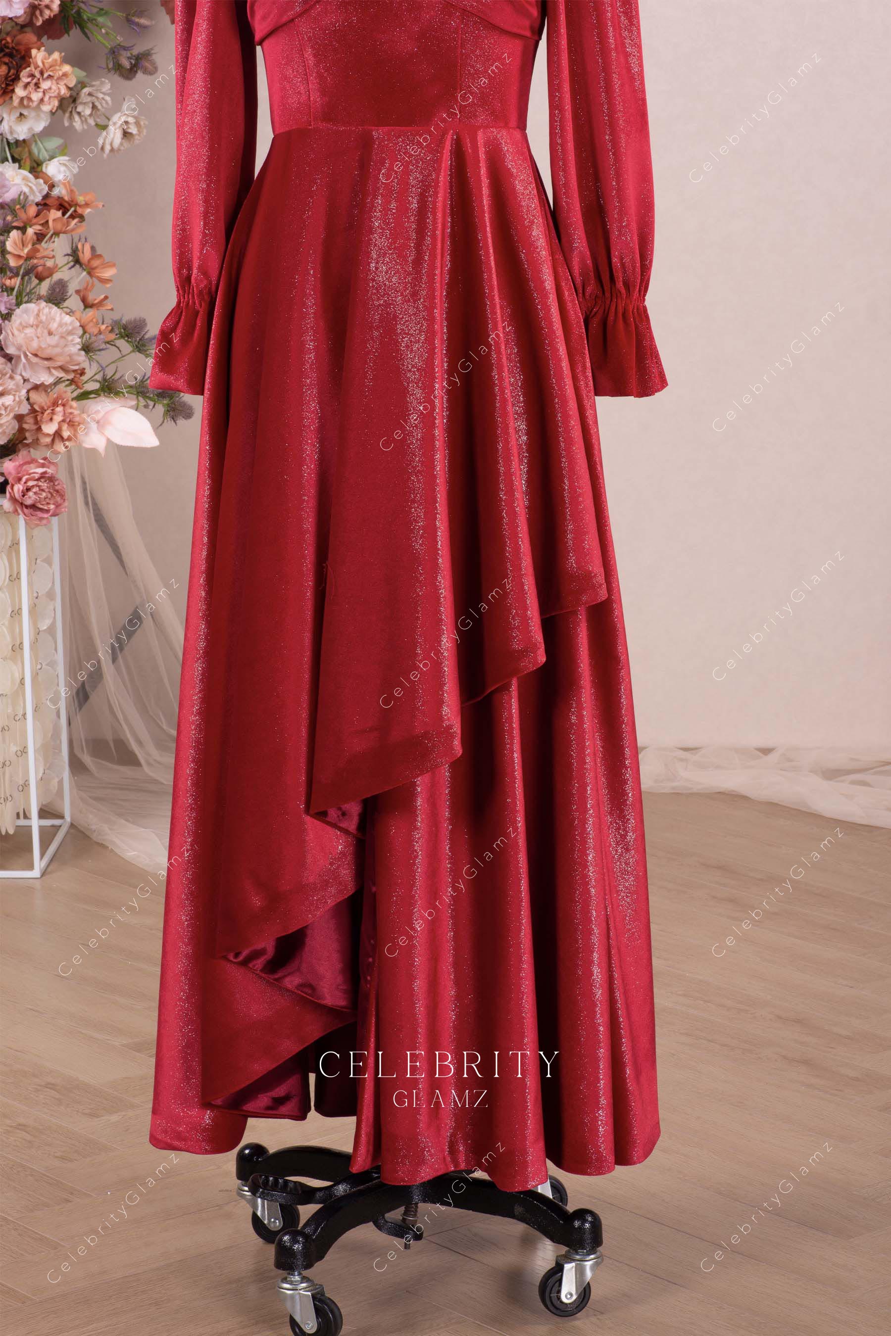Shine in our red shimmery velvet formal dress. Featuring a square neck with pearl embellishments, long bubble sleeves, pleated bowknot, and an A-line skirt. Perfect for winter parties and festive occasions.