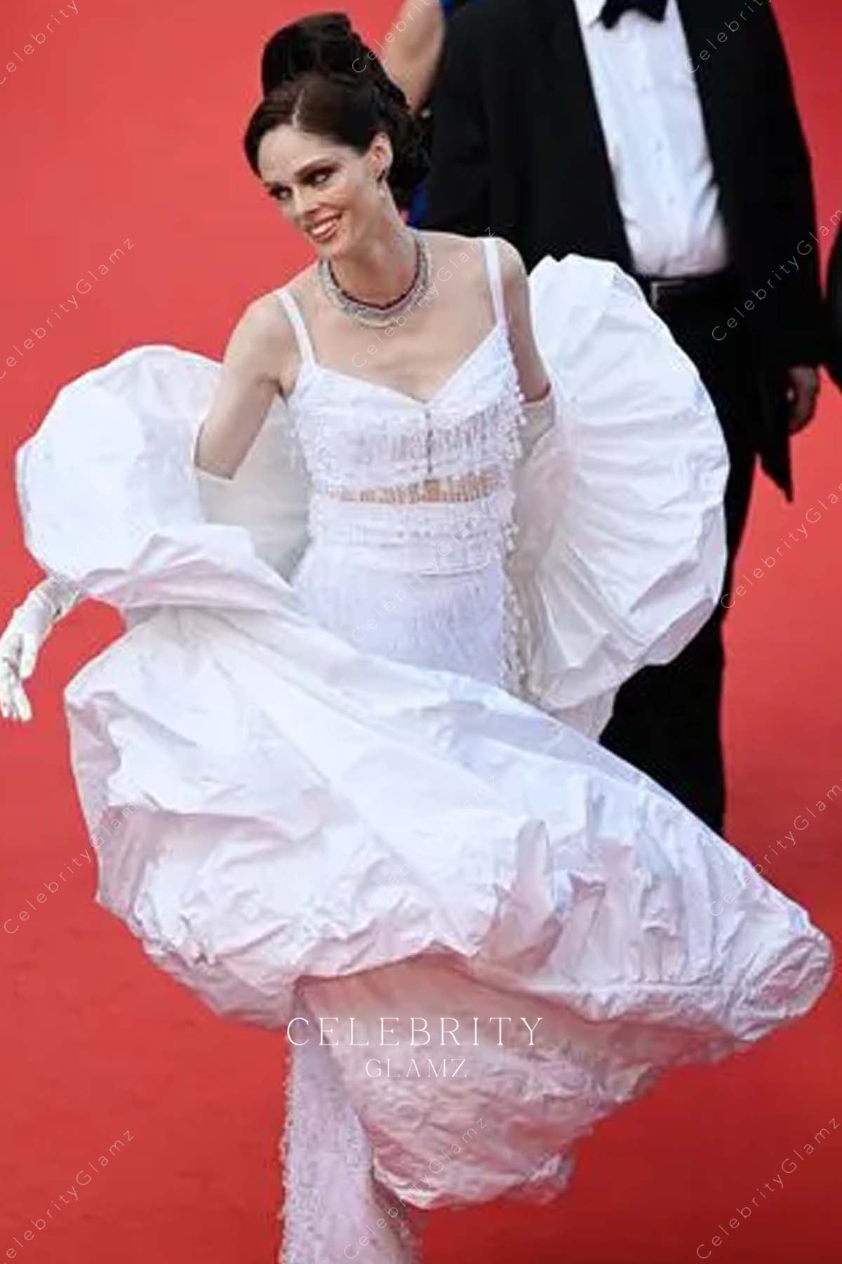 Turn heads in the Coco Rocha 2023 Cannes red carpet dress. This two-piece gown features a sleeveless beaded tassel design, floor-length column skirt, and a removable taffeta cape for versatile red carpet glamour.