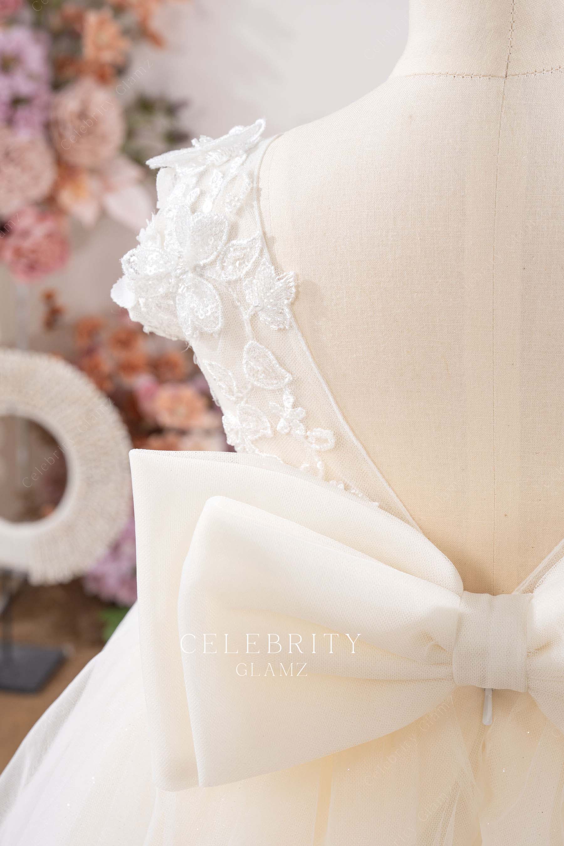 Enchanting ivory flower girl dress with beaded lace bodice, illusion cap sleeves, and bateau neckline. Puffy tea-length skirt and V-back with bow make it perfect for weddings & special occasions.