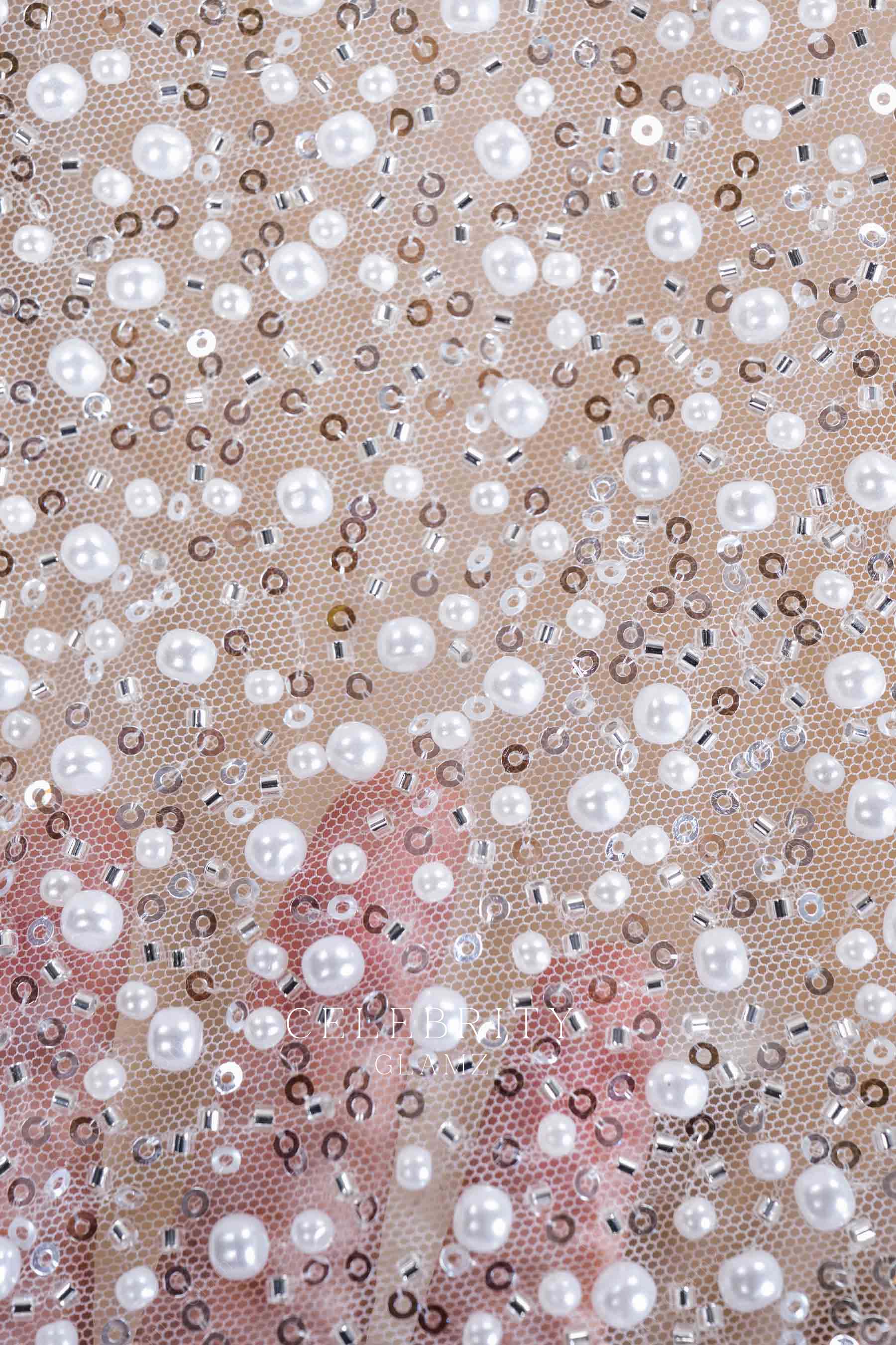 Add luxury to your designs with this heavily beaded tulle fabric, featuring pearls in various sizes, clear sequins, and silver bugle beads. Perfect for couture gowns, wedding dresses, and eveningwear with show-stopping elegance.