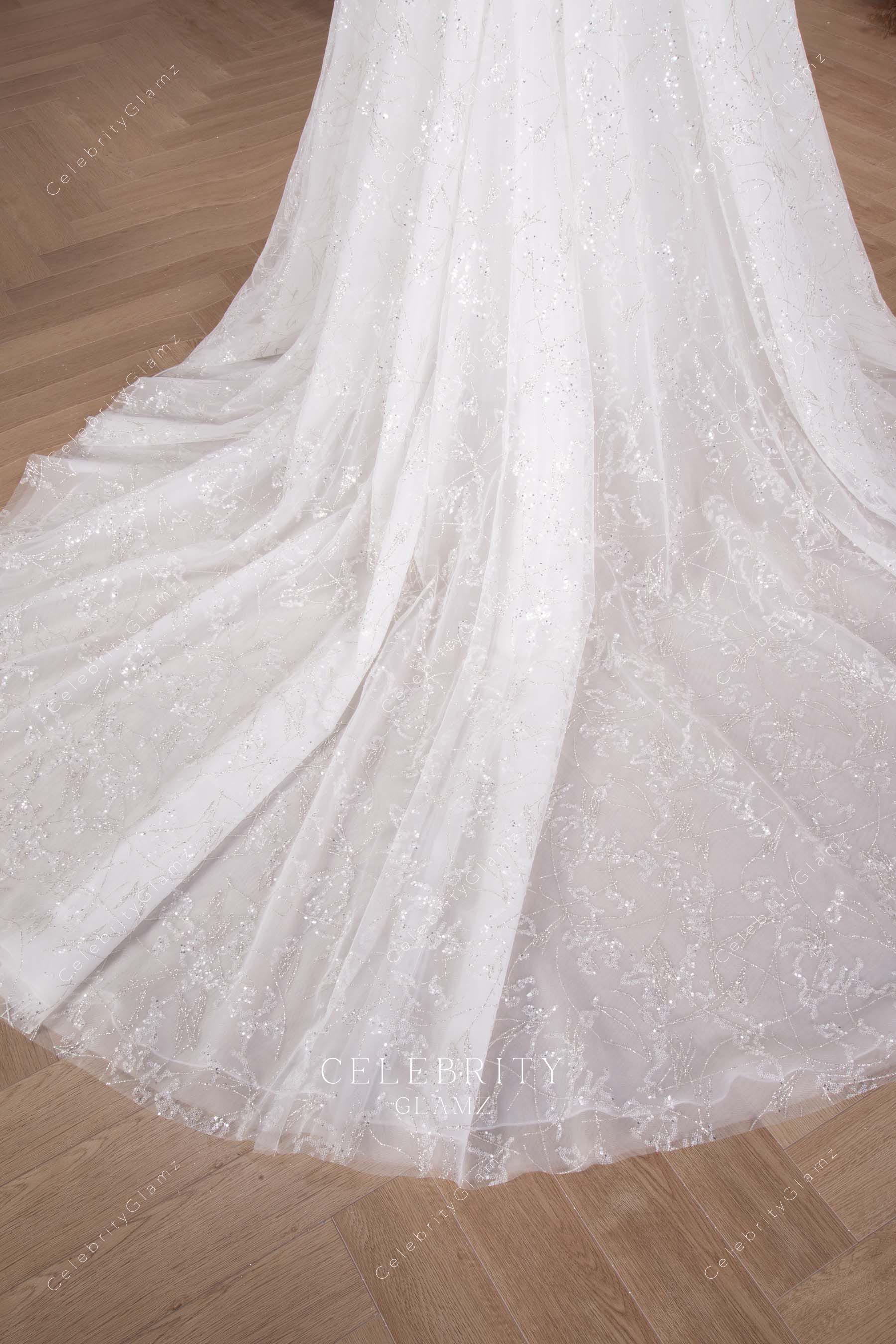 Make your day unforgettable in this A-line sleeveless wedding dress. Featuring a shimmer illusion corset bodice, scoop neckline, thin straps, and a flowing long train for timeless sparkle and romance.